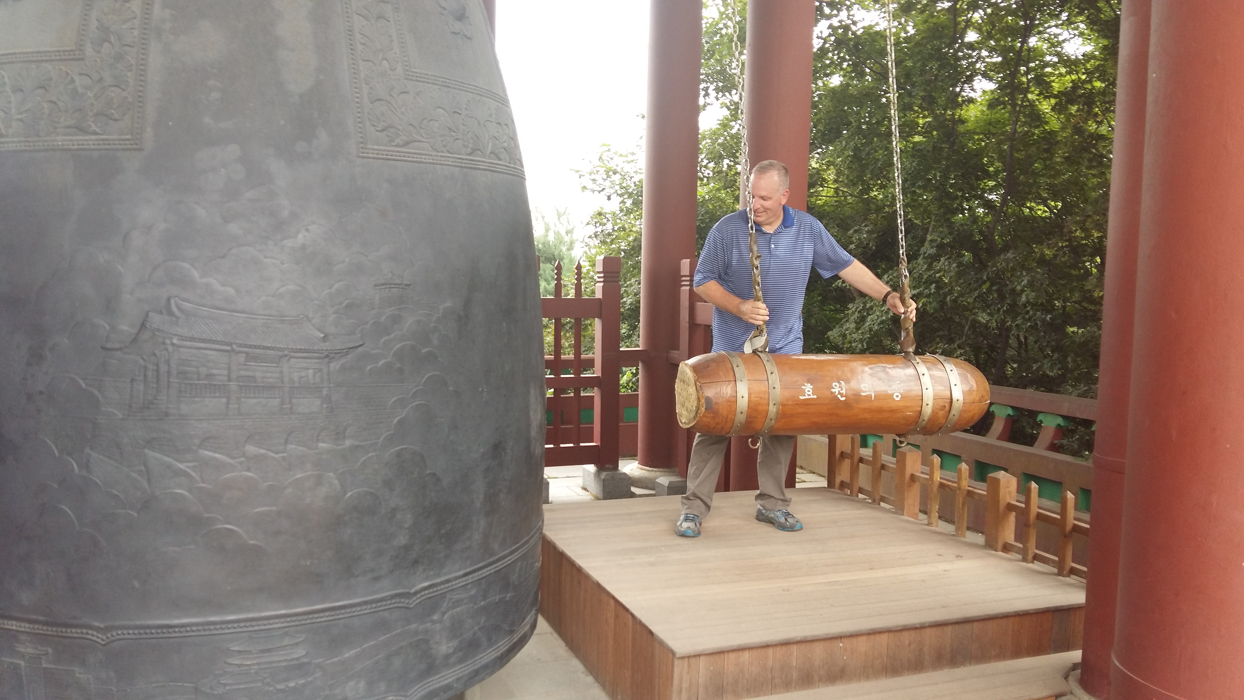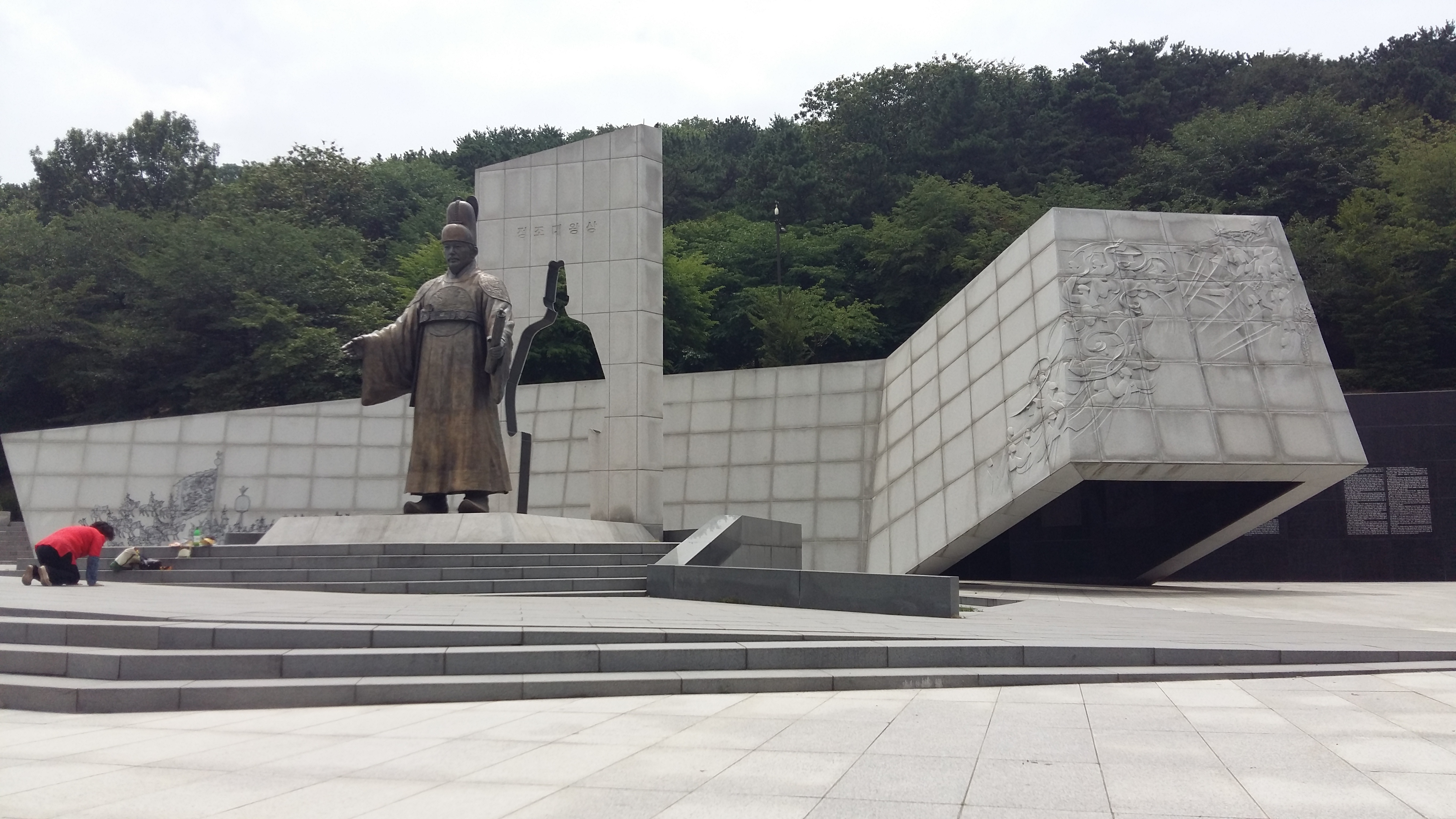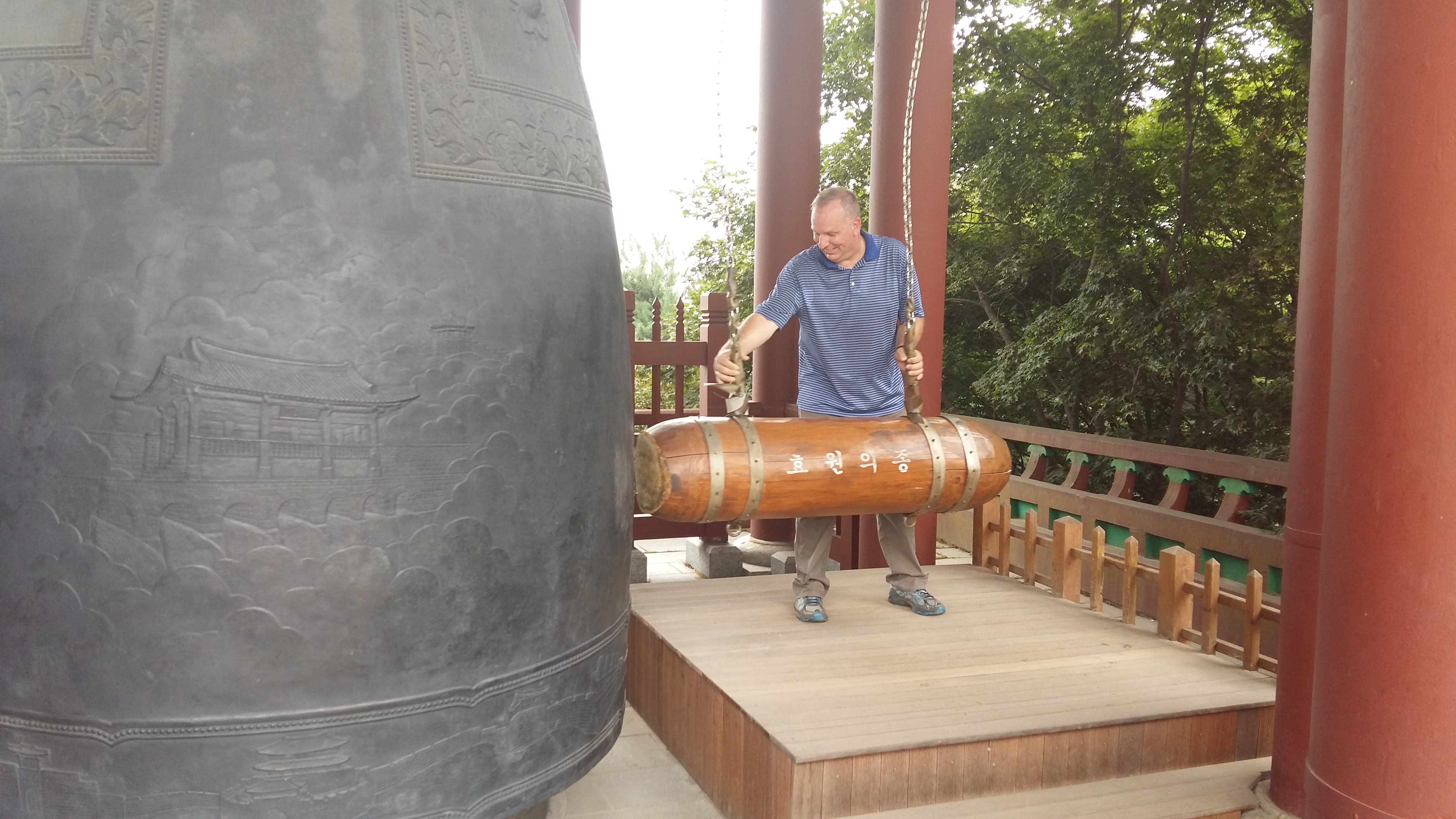 The “mall” in the Suwon train station.The view of Suwon from the exit of the train station.The buses had TV and free WiFI!Our first view of part of the fortress as we got off of the bus.Down this street you can see the long path of steps we will be climbing!Many steps…Many, many steps!Once we got to the top, there were a lot of neat things to see. This is Seosam Ammun. An “Ammun” is a secret gate “set up in a deep spot to provide war supplies to the fortress without being caught by enemies. In case of an emergency, an ammun could be closed by filling it up with stones and laying some earth next to the gate.”There were several Chiseongs or turrets “to monitor and attack enemies who had reached the fortress.”This is SeoPoru. A “Porus” is a sentry post.This is the “March 1st Independence Movement Memorial.” It is “to commemorate Korean ancestors’ valuable resistance to regain the national sovereignty and pray for the repose of their soul.”This is the Memorial of Korean Independence. It was “established on August 15th, 1948 by Suwon citizens to commemorate Korea’s restoration of independence.”Now we come to the bell of Filial Piety. The bell is “tolled” (?) every hour 1000-1800 daily, three times. The first toll is to show gratitude and respect to your parents. The second is to wish for your family’s health and harmony. The third is to wish for the realization of your dreams.I had to give it a shot!It was impossible to miss!Of course my assistant had to give it a go!Up from the Filial Bell was another ammun which we went out and saw the outside of the wall up close.…and the other side.Then looking down the hill from the wall to an interesting formation of trees.Moving on, we came to the highest point of the fortress, the SeoJandae. A jangdae is a command post and this one was “where military command was established around the fortress at the summit of Paldal Mountain.”From SeoJangdae there were great views of Suwon city below.From SeoJangdae there were great views of Suwon city below.From SeoJangdae there were great views of Suwon city below.Starting down Paldal Mountain, there was a bronze statue of King Jeongjo the Great, the King who had this fortress built. Notice the woman in red bowing down to the statue. Not sure if she was praying, or what but she had laid out a variety of food in front of the statue.It was an impressive statue. Notice again the woman in red spreading out a variety of food. Until I saw her kneel, I thought she was spreading out her lunch to eat it.On the way down from Paldal Mountain, we saw the trolley which runs around a large portion of the fortress (though not to the top!).Getting back to “city-level,” we started up a small street (I think it was Rodeo Street) to the restaurant we take the group to.…and here it is, *Something in Korean* Part I!Fortunately, we had our KATUSA to translate for us! I’m not sure why we were so bunched up for this picture…my assistants must really like me!They bring out a grill with hot coals to cook at the table. The pipe above it (and at each table) is a vent that sucks out the smoke.Our KATUSA (as the youngest) also did the cooking!I ordered the Bulgogi, which comes with a lot of extra stuff. It was great (much better than my Bulgogi Burger at McDonald’s)!On the way back to the bus, we came across a Buddhist monastery. Like all traditional Korean architecture, the buildings were very colorful.The other side of the entry arch showing more of the colorful and intricate architecture.There were places for the Buddhist monks and others to pray. This building seemed to have separate booths.This appeared to be more like a temple.Here’s the inside of the temple.The banner hanging higher, to the right, says something about praying for your children, that they will get into a good university.Finally on the train on the way home, our KATUSA was wore out!