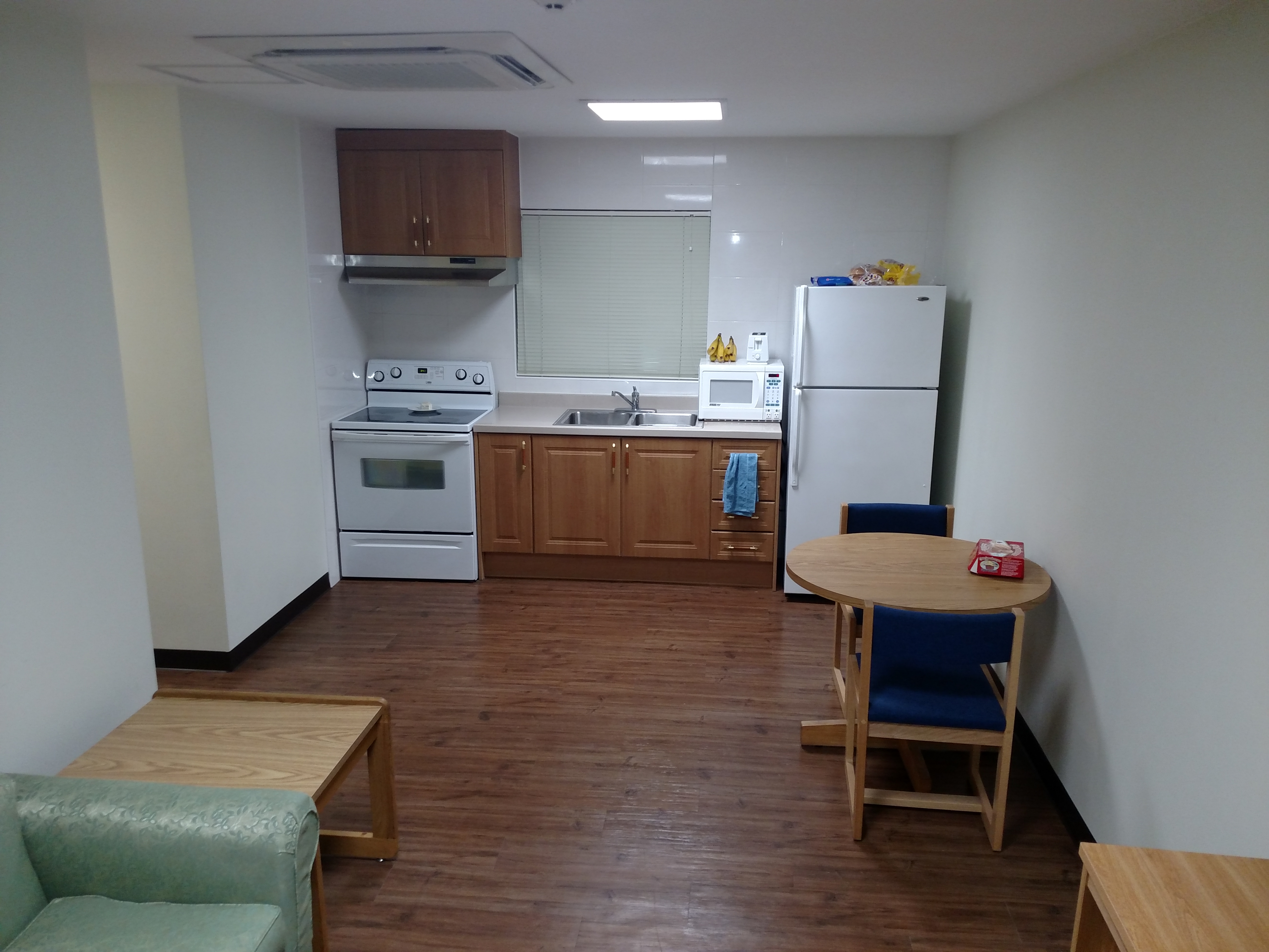 I have a humungous laundry room (the other half isn’t in the picture!) with a large closet with shelving for storage…but I didn’t bring that much stuff!Here’s the other side of the “great room” showing the kitchen. There’s not a lot of cabinet space, but I really don’t need much.