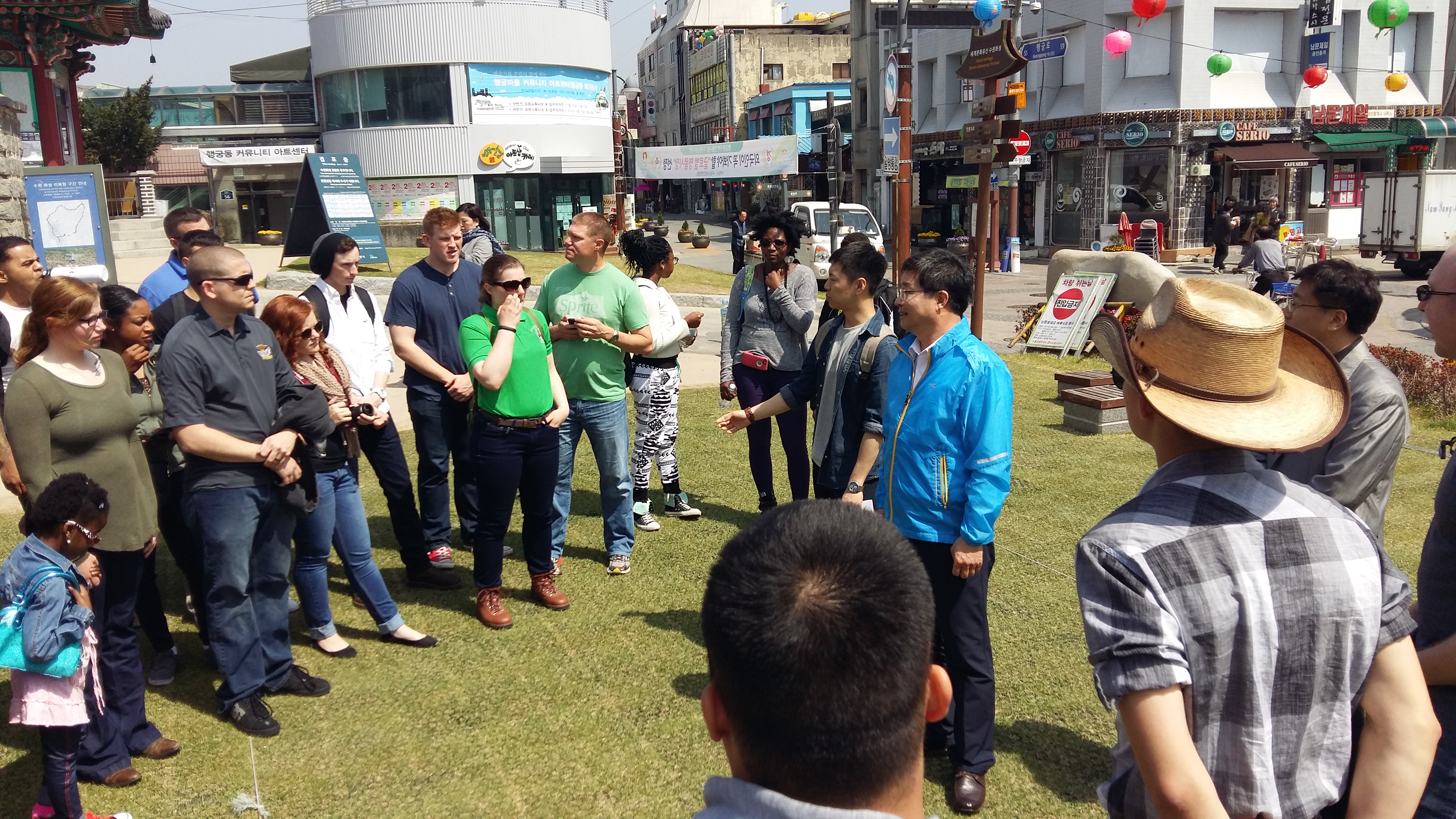 The mayor of Suwon (in the blue jacket) speaks to our group.